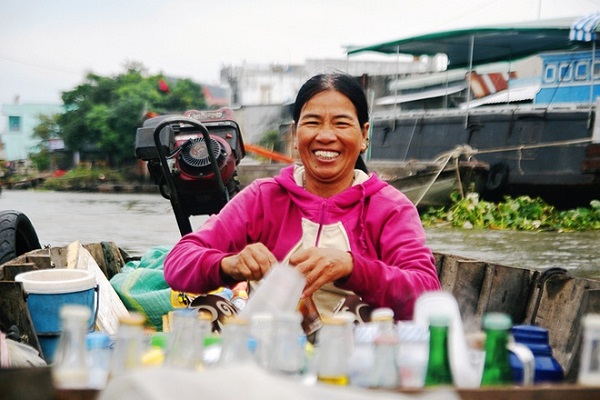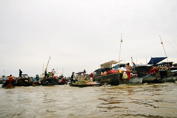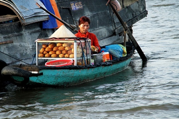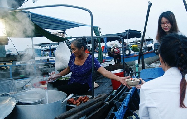 Những chiếc ghe lỉnh khỉnh đồ ăn, vật dụng nấu nướng ngược xuôi chào mời mỗi khi thấy một đoàn khách đi qua. Bạn chỉ cần ngồi yên và gọi bất kỳ một chiếc ghe nào đấy là có thể thưởng thức bữa ăn sáng đậm đà hương vị sông nước miền Tây.