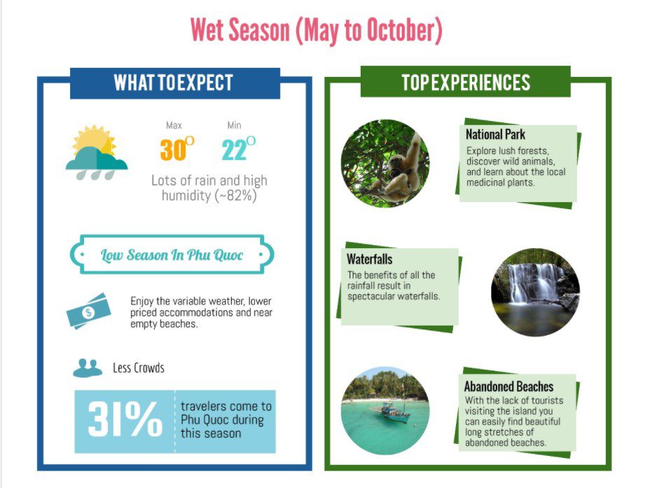 Vào mùa mưa ở Phú Quốc, bắt đầu từ cuối tháng 5 đến đầu tháng 10, mặc dù không phải là thời điểm tốt nhất để tham quan, nhưng vẫn có những trải nghiệm thú vị khi bạn đi du lịch vào mùa này.