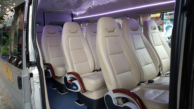 Nội thất xe Ford Transit Luxury của MGM đã được nâng cấp thêm tay vịn, bọc da toàn bộ.